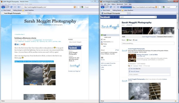 Sarah Meggitt Photography also asked that social media be utilised – specifically, a Facebook fan page. I used my knowledge to create a fan page, similarly training in its use. I also ensured that there was a healthy crossover between the website and the fan page with a Facebook Badge in the right column of the website.